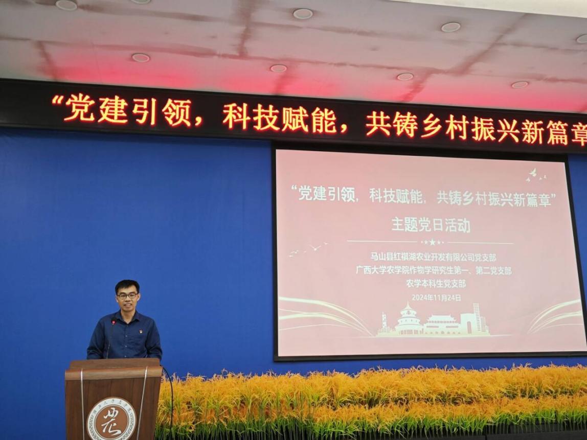为深入贯彻党的二十届三中全会精神和中央一号文件精神关于创新驱动发展战略和农业农村现代化的重要部署,积极响应国家全面推进乡村振兴、加快农业强国建设的号召,1124日上午,作物学研究生第二党支部积极利用马山县红湖农业开发有限公司党支部共同签订结对共建协议的资源,联合作物学研究生第一党支部、农学本科生党支部邀请了马山县红湖农业开发有限公司党支部到公司开展党建引领,科技赋能,共铸乡村振兴新篇章主题党课。本次党课,我们荣幸邀请到了马山县红祺湖农业开发有限公司党支部书记甘昌军同志做主讲。