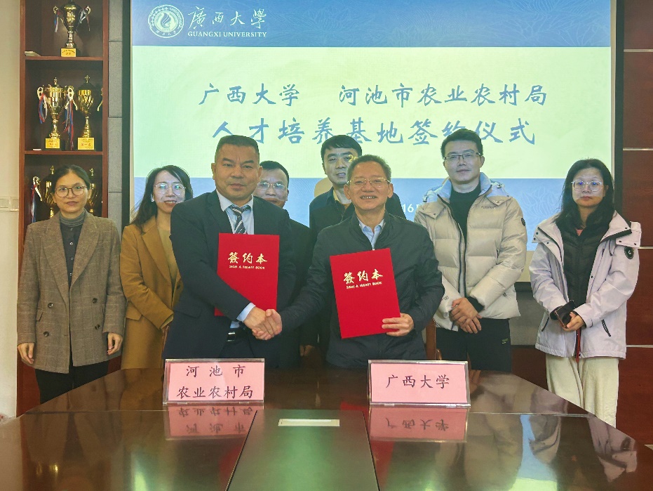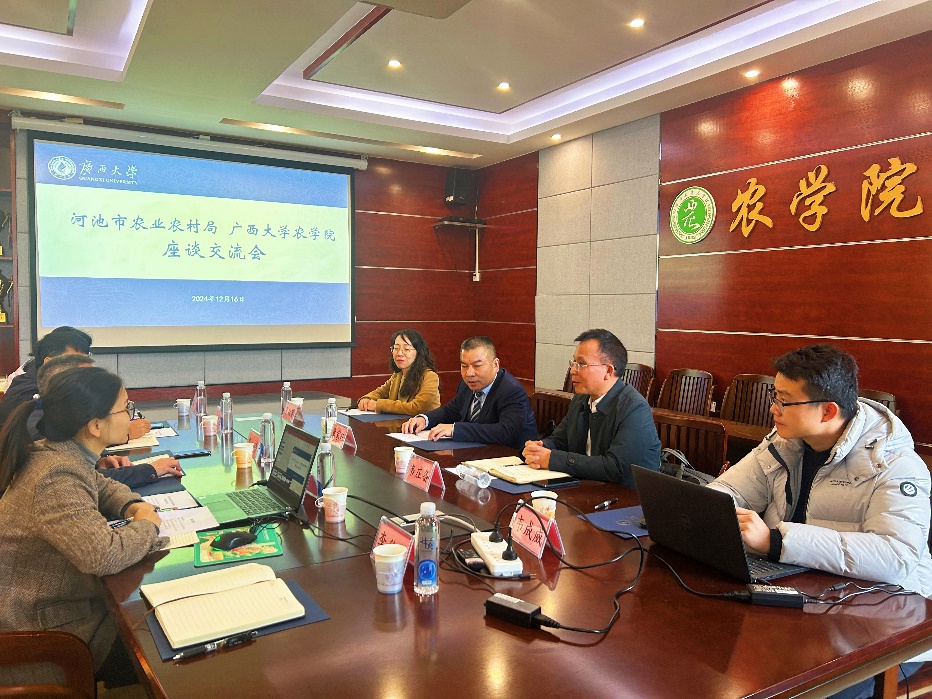 2024年12月16日上午,我院与河池市农业农村局举行人才培养工作座谈会并签署合作备忘录。河池市委农办主任、河池市农业农村局党组书记、局长覃家旺,河池市农业农村局副局长韦庄备;农公司党委书记袁涛,农公司党委副书记甘敏思、公海gh555000aa线路检测副经理韦燕燕出席座谈会暨签约仪式。农公司党委书记袁涛、河池市委农办主任覃家旺分别代表双方签约。