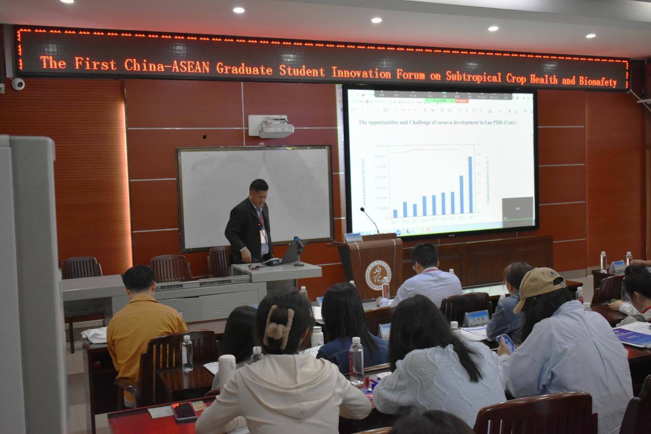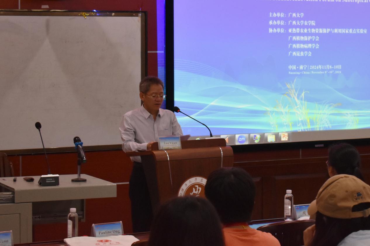 论坛特别邀请了国内及老挝、马来西亚、越南等东盟国家的专家学者,分别作题为“香蕉枯萎病在老挝的分布特征”“老挝木薯丛枝病研究进展”“利用可见光和近红外光谱及基于进化计算的波长选择最大化甘蔗病害检测”“堆肥产品与植物活化剂的综合施用改善土壤养分和水稻产量”“14-3-3蛋白调控糖镰刀菌生长、产孢和致病性的分子机制”的主旨报告,共同探讨亚热带作物病虫害防控问题。